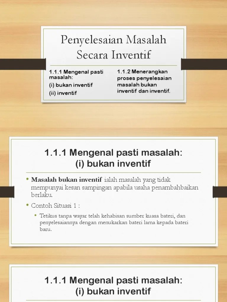 Berikan satu contoh masalah bukan inventif. Oleh sitiaishahdin73 · 1.1.1 mengenalpasti masalah inventif dan bukan . Slide tajuk 1.1.1 mengenal pasti masalah inventif dan bukan inventif dan tajuk 1.1.2 menerangkan proses penyelesaian masalah inventif dan . Ialah masalah yang dapat diselesaikan tanpa mempunyai kesan sampingan.